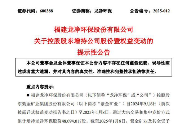 福建龙净环保股份有限公司(简称:龙净环保)近日发布《关于控股股东增持公司股份暨权益变动的提示性公告》。 公告显示,2025年1月9日至2月10日,紫金矿业通过集中竞价方式累计增持公司股份5,028,900股,占公司总股本的0.3960%。本次权益变动后紫金矿业及其全资子公司合计持有公司股份数量为317,511,529股,占公司总股本...