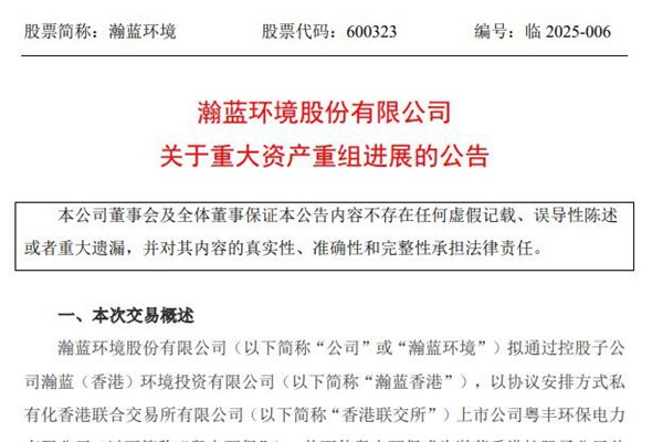 瀚蓝环境股份有限公司(简称:瀚蓝环境)1月16日发布《关于重大资产重组进展的公告》。据该公告,瀚蓝环境于近日收到国家发展改革委《境外投资项目备案通知书》(发改办外资备[2025]16 号),国家发展改革委对瀚蓝(佛山)投资有限公司并购粤丰环保不超过 92.78%股权的项目予以备案。因此,瀚蓝环境本以协议安排方式私有化香港联合交易所有限...