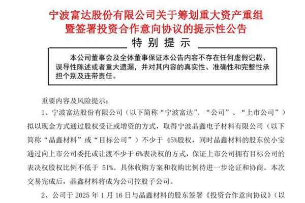2025年01月17日,宁波富达股份有限公司发布《关于筹划重大资产重组暨签署投资合作意向协议的提示性公告》。图源:宁波富达公告 公告表示,宁波富达拟以现金方式通过股权受让或增资的方式,取得宁波晶鑫电子材料有限公司不少于 45%股权,同时晶鑫材料的股东侯小宝通过向上市公司委托或让渡不少于6%表决权的方式,保证宁波富达拥有晶鑫材料的表决...