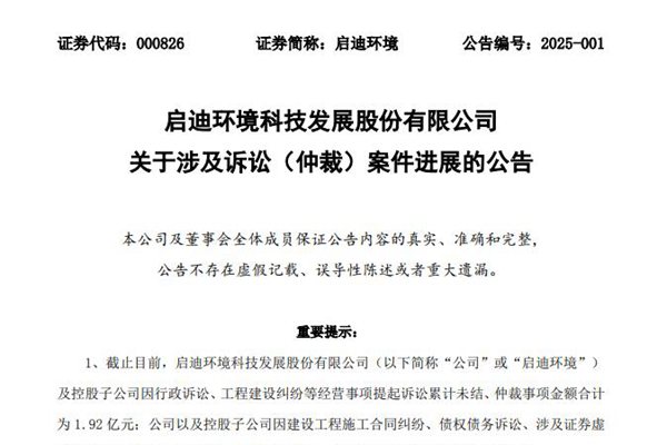 启迪环境科技发展股份有限公司(简称:启迪环境)1月17日发布《关于涉及诉讼(仲裁)案件进展的公告》。 截至目前,启迪环境及其控股子公司累计诉讼、仲裁事项金额合计 23.47 亿元,占启迪环境最近一期经审计净资产的 40.23%。其中,启迪环境及控股子公司因行政诉讼、工程建设纠纷等经营事项提起诉讼累计未结、仲裁事项金额合计为 1.92...