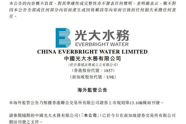 1月15日,中国光大水务有限公司(简称:中国光大水务)公布,根据公司、上海交通建设总承包有限公司与安阳市住房和城乡建设局于2024年6月6日订立的特许经营协议的条款,董事会谨此宣布,公司与上海交通建设已设立一间合营公司光水水务(安阳)有限公司,以承接中国河南省安阳市的污水处理厂。 新合营公司以约2.21亿元人民币的注册资本设立,该公...