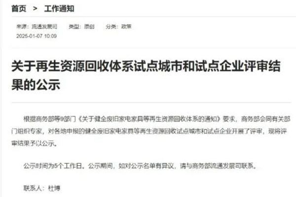 根据商务部等9部门《关于健全废旧家电家具等再生资源回收体系的通知》要求,商务部会同有关部门组织专家,对各地申报的健全废旧家电家具等再生资源回收试点城市和试点企业开展了评审,现已予以公示。 中国再生资源集团所属江西中再生资源开发有限公司、四川中再生资源开发有限公司、北京城资(环保)科技发展有限公司、云南巨路环保科技有限公司通过评审,成...
