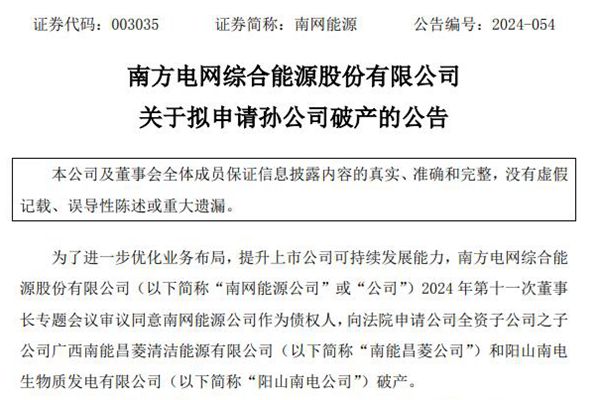 南方电网综合能源股份有限公司(简称:南方电网)近日公告称,公司拟申请公司全资子公司之子公司广西南能昌菱清洁能源有限公司(以下简称“南能昌菱公司”)和阳山南电生物质发电有限公司(以下简称“阳山南电公司”)破产。 南能昌菱公司成立于2014年6月6日,注册资本超1亿元,主要从事对新能源、可...