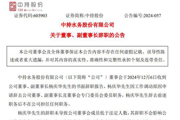 中持水务股份有限公司(简称:中持股份,下称“中持水务”)近日公告称,公司董事、副董事长杨庆华先生的书面辞职报告,杨庆华先生因工作调动原因申请辞去公司董事、副董事长及董事会专门委员会委员职务,杨庆华先生辞去前述职务后不在公司担任任何职务。 中持水务成立于2009年,上市日期:2017年3月14日。公司主营业务:...