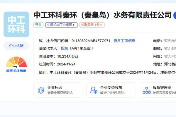 11月24日,中工环科秦环(秦皇岛)水务有限责任公司成立,法定代表人为杨东,注册资本约1.02亿人民币,经营范围为污水处理及其再生利用;水资源管理;水污染治理;市政设施管理。 该公司由中工环境科技有限公司持股95%、秦皇岛环保产业集团有限公司持股5%。 中工环境科技有限公司是A股上市企业中工国际工程股份有限公司(简称:中工国际)全...