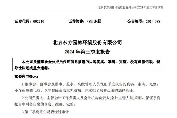 北京东方园林环境股份有限公司(简称:*ST东园 ,下称“东方园林”)近日发布《2024 年第三季度报告》,前三季度公司实现营业收入6.85亿元,同比下降61.09%;归母净利润亏损22.8亿元,上年同期亏损19.53亿元;扣非净利润亏损19.53亿元,上年同期亏损19.54亿元;经营活动产生的现金流量净额为24...