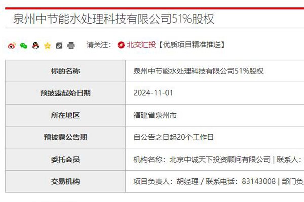 据北京产权交易所网站消息,近日,泉州中节能水处理科技有限公司51%股权公开挂牌转让。据悉,该公司注册资本7000万元,主要从事电镀污水处理、废气处理,污泥处理;批发、零售化工产品等,由中国启源工程设计研究院有限公司持股51%,晋江华懋电镀集控区开发管理有限公司持股49%。 此次转让方系中国启源工程设计研究院有限公司,为中国节能环保集...