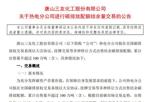 2024年10月10日,唐山三友化工股份有限公司发布《关于热电分公司进行碳排放配额结余量交易的公告》。图源:三友化工公告 公告称,唐山三友化工股份有限公司(以下简称“公司”)热电分公司拟在全国碳排放权交易系统以大宗协议、挂牌交易等多种转让方式出售结余碳排放配额,累计出售量不超过 100 万吨(含)。 根据目...