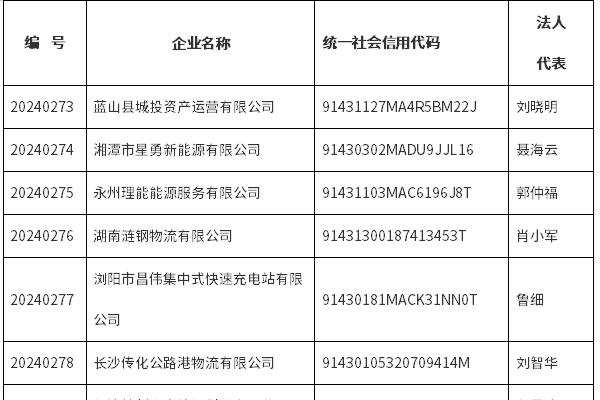 2024年湖南省第十批电动汽车充电设施运营企业公示 根据《湖南省电动汽车充电基础设施建设与运营管理办法》(湘发改能源规〔2021〕916号),由企业申请,经对企业提交的备案资料进行审查,同意对以下45家电动汽车充电设施运营企业进行备案,现向社会公示。若公示期满无异议,该批企业将自动纳入我省电动汽车充电设施运营服务商目录。 公示时间为2...