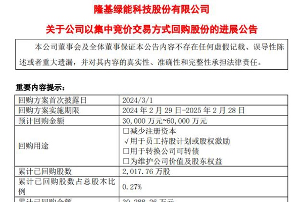 2024年10月9日,隆基绿能科技股份有限公司发布《 关于公司以集中竞价交易方式回购股份的进展公告》。 回购方案实施期限:2024 年 2 月 29 日-2025 年 2 月 28 日 预计回购金额:30,000 万元~60,000 万元 累计已回购股数:2,017.76 万股 累计已回购股数占总股本比例:0.27% 累计已...