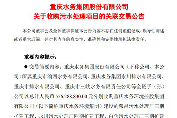 2024年10月1日,重庆水务集团股份有限公司发布《关于收购污水处理项目的关联交易公告》。图源:重庆水务公告 公告表示,重庆水务旗下全资子公司/孙公司以总计人民币 556,288,830.00 元分别收购重庆水务环境控股集团有限公司建设的荣昌污水处理厂三期扩建工程、永川污水处理厂四期扩建工程、白含污水处理厂三期扩建工程、蔡家污水处理...