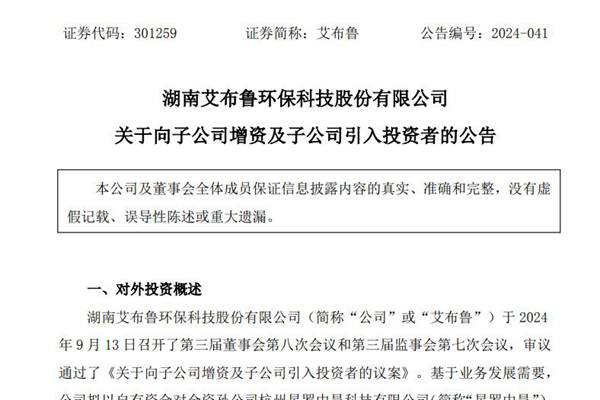 湖南艾布鲁环保科技股份有限公司(简称:艾布鲁)9月14日公告称,公司基于业务发展需要,拟联合全资子公司星罗智算科技(杭州)有限公司(简称“星罗智算”)向全资孙公司杭州星罗中昊科技有限公司(简称“星罗中昊”)增资,并引入投资者。 星罗中昊将借此获得三笔增资,分别为:①艾布鲁以自有资金1....