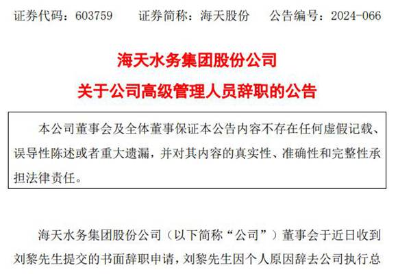 海天水务集团股份公司(简称:海天股份)近日发布《关于公司高级管理人员辞职的公告》。公告显示,海天股份董事会收到了刘黎先生提交的书面辞职申请,刘黎先生因个人原因辞去公司执行总裁职务,辞职后刘黎先生将不再担任公司及子公司任何职务。 海天股份表示,刘黎先生所负责的工作已妥善交接,其辞职不会对公司正常生产经营活动产生不利影响。图源:海天股份...