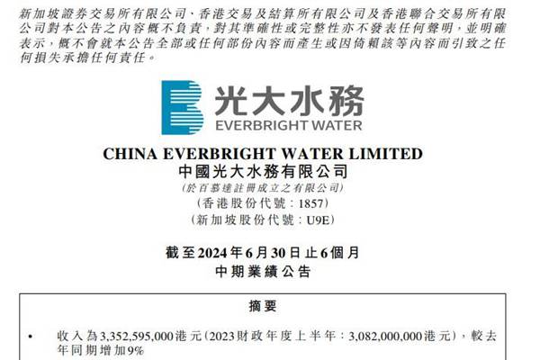 中国光大水务有限公司(简称:中国光大水务)近日发布了截至2024年6月30日止6个月的中期业绩公告。根据财报显示,公司在2024年上半年实现收入33.53亿港元,同比增长9%;除利息、税项、折旧及摊销前盈利(EBITDA)为11.96亿港元,同比下降7%;本公司权益持有人应占盈利为5.81亿港元,同比下降8%。 在2024年上半年,...