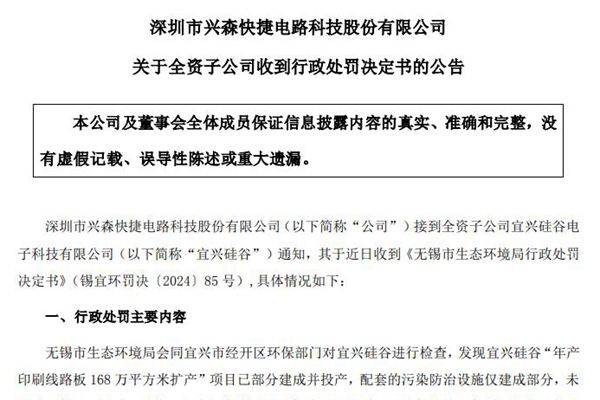 深圳市兴森快捷电路科技股份有限公司(简称:兴森科技)近日公告称,公司全资子公司宜兴硅谷电子科技有限公司(下称“宜兴硅谷”)收到了《无锡市生态环境局行政处罚决定书》(锡宜环罚决〔2024〕85 号),原因系“年产印刷线路板 168 万平方米扩产”项目已部分建成并投产,配套的污染防治设施仅建...