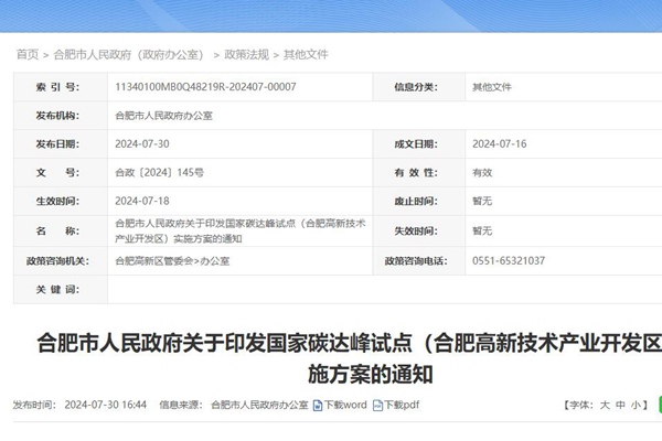 合肥市人民政府关于印发国家碳达峰试点(合肥高新技术产业开发区)实施方案的通知 合肥高新区管委会: 现将《国家碳达峰试点(合肥高新技术产业开发区)实施方案》印发给你们,请结合工作实际,认真组织实施。 2024年7月16日国家碳达峰试点(合肥高新技术产业开发区)实施方案 为深入贯彻党中央、国务院关于碳达峰碳中和重大战略决策,全面落实国...