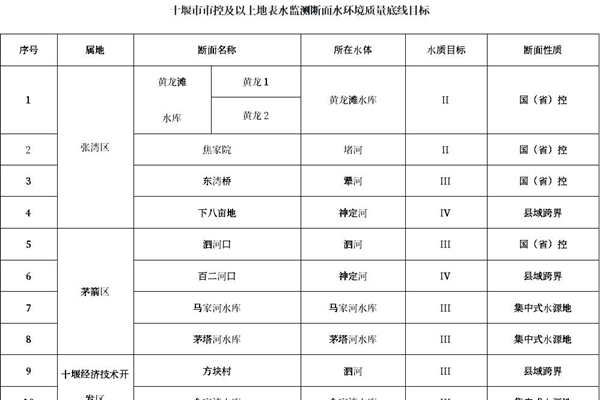 十堰市2024年度水污染防治攻坚行动实施方案 为深入推进流域水环境综合治理,坚决守牢水环境安全底线,根据国家、省关于深入打好污染防治攻坚战相关要求,结合我市实际,制定本方案。 一、水环境质量目标 2024年,丹江口水库水质稳定保持II类标准;27个省级及以上地表水监测断面优良率达到96.3%,纳入全市水环境质量评级的市控及以上44个...