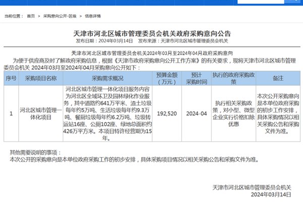 距离天津市河北区环卫一体化PPP项目宣布终止仅过去一周时间,“天津市河北区城市管理一体化(特许经营)项目”于近日发布了政府采购意向。 天津市政府采购网公告显示,3月14日,天津市河北区城市管理委员会公布2024年3月至2024年4月政府采购意向,河北区城市管理一体化(特许经营)项目计划于2024年4月份招标,...