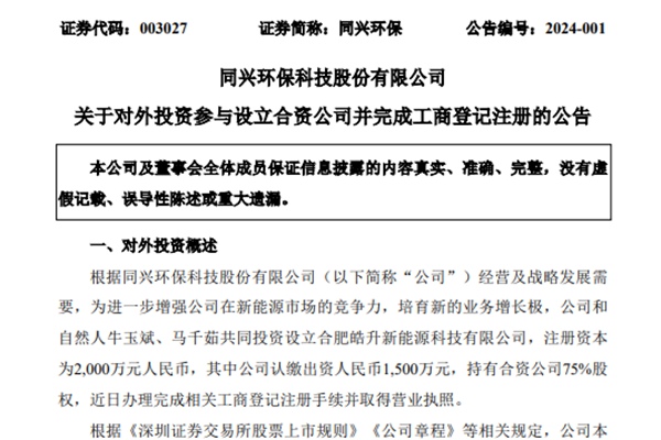 2024年1月13日公告,同兴环保科技股份有限公司(下称“同兴环保”)为进一步增强公司在新能源市场的竞争力,培育新的业务增长极,与两位自然人共同投资设立合肥皓升新能源科技有限公司。 合肥皓升新能源科技有限公司成立日期:2024年1月10日,注册资本2000万元人民币,同兴环保认缴出资比例75%,涉人民币150...