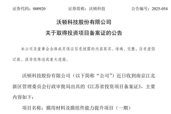 10月9日,沃顿科技股份有限公司(简称:沃顿科技)公告称,公司已收到南京江北新区管理委员会行政审批局出具的《江苏省投资项目备案证》,主要内容如下: 项目名称:膜用材料及膜组件能力提升项目(一期) 项目法人:沃顿科技股份有限公司 建设地点:江苏省南京市江北新区新材料科技园 项目总投资:55,000万元 沃顿科技表示,本次公告事...