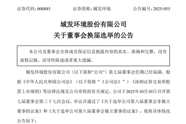 城发环境股份有限公司(简称:城发环境)公告称,公司于2025年10月10日召开第七届董事会第三十七次会议,审议并通过了《关于选举公司第八届董事会非独立董事的议案》和《关于选举公司第八届董事会独立董事的议案》,确认公司第八届董事会由9名董事组成,其中,非独立董事6名(含1名职工代表董事),独立董事3名。 经过城发环境董事会提名委员会资...