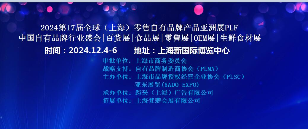 中国自有品牌行业盛会|百货展|食品展|零售展|OEM展|生鲜食材展 展会时间:2024年12月4日-12月6日 展会地点:上海新国际博览中心 审批单位:上海市商务委员会 战略支持:自有品牌制造商协会(PLMA) 主办单位:上海市品牌授权经营企业协会(PLSC) 亚东展览(YADO EXPO) 承办单位:跨采(上海)广告有限公司 招展单位...