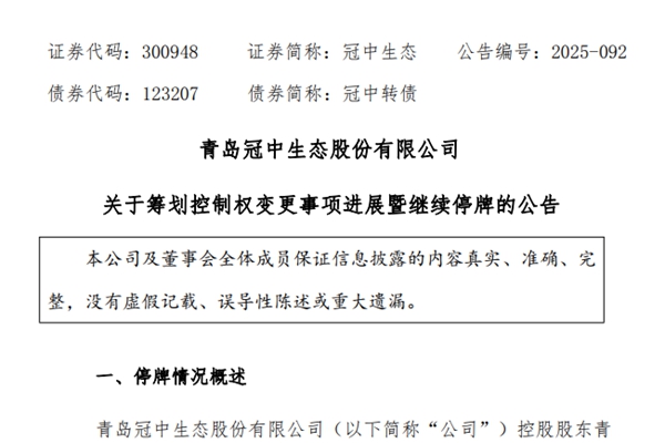 2025年9月22日,主营土壤修复、水环境治理的冠中生态发布停牌公告。主因系青岛冠中生态股份有限公司控股股东青岛冠中投资集团有限公司及实际控制人李春林先生和许剑平女士正在筹划公司控制权变更相关事宜,该事项可能导致公司控股股东及实际控制人发生变更。经公司向深圳证券交易所申请,公司股票及可转换公司债券自2025年9月22日(星期一)开市起...