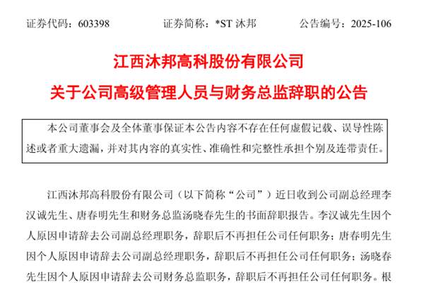江西沐邦高科股份有限公司(简称:*ST沐邦)公告称,公司近日收到公司副总经理李汉诚先生、唐春明先生和财务总监汤晓春先生的书面辞职报告。李汉诚先生因个人原因申请辞去公司副总经理职务,辞职后不再担任公司任何职务;唐春明先生因个人原因申请辞去公司副总经理职务,辞职后不再担任公司任何职务;汤晓春先生因个人原因申请辞去公司财务总监职务,辞职后不...
