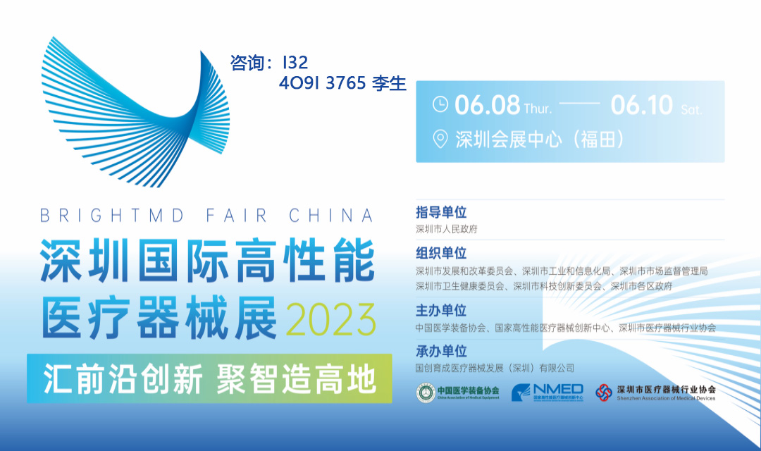 高性能医疗器械展,医学影像展区,人工智能及机器人展,应急救治及康复展,医学检验展,医院建设及数字医疗展,医疗创新产品展,医院成果转化展,医疗器械制造供应链展 2023中国深圳国际高性能医疗器械展 2023中国国际高性能医疗器械展览会 指导单位:深圳市人民政府 主办单位:中国医学装备协会、国家高性能医疗器械创新中心、深圳市医疗器械行业协会 ...