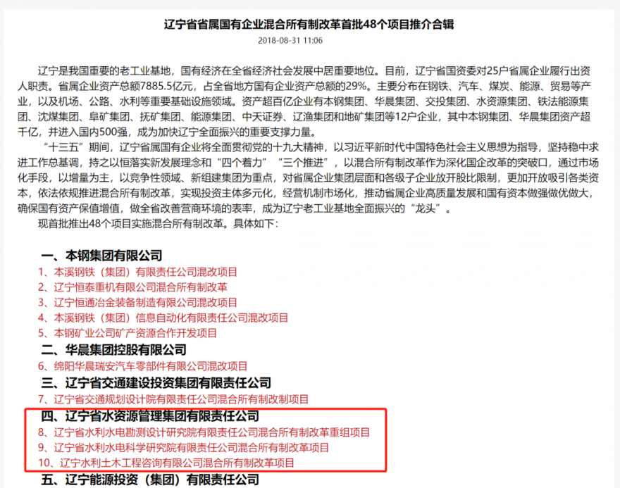 2021年5月,辽宁省国资委召开推介会,推出第一批75个国有企业混改项目。首批推出75个国有企业混改项目,涉及资产总额1074亿元,其中含有多个涉环保国企混改项目,吸引了环境产业的高度关注,其中辽宁省水资源管理集团有限责任公司旗下全资子公司辽宁省水利水电勘测设计研究院有限责任公司(以下简称“辽宁水利设计院”)和控股子公司辽宁水...