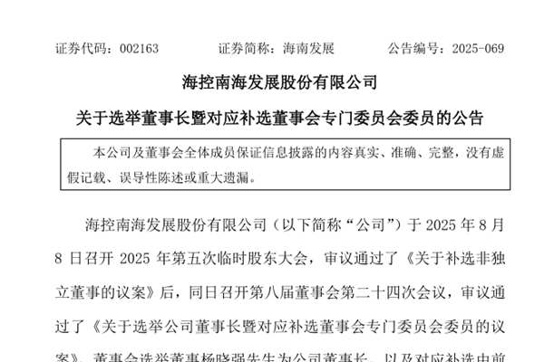 海控南海发展股份有限公司(简称:海南发展)公告称,公司于2025年8月8 日召开2025 年第五次临时股东大会,审议通过了《关于补选非独立董事的议案》后,同日召开第八届董事会第二十四次会议,审议通过了《关于选举公司董事长暨对应补选董事会专门委员会委员的议案》,董事会选举董事杨晓强先生为公司董事长,以及对应补选由前任董事长担任的战略委员...