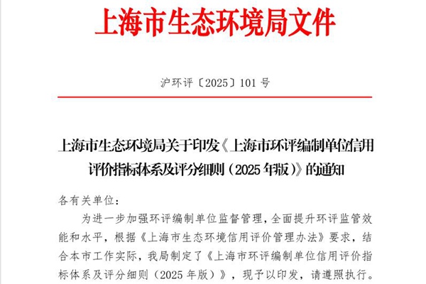 上海市生态环境局关于印发《上海市环评编制单位信用评价指标体系及评分细则(2025年版)》的通知沪环评〔2025〕101号 各有关单位: 为进一步加强环评编制单位监督管理,全面提升环评监管效能和水平,根据《上海市生态环境信用评价管理办法》要求,结合本市工作实际,我局制定了《上海市环评编制单位信用评价指标体系及评分细则(2025年版)》,...