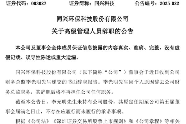 同兴环保科技股份有限公司(简称:同兴科技)近日公告称,公司董事会收到了财务总监李光明先生递交的书面辞职报告。李光明先生因个人原因辞去公司财务总监职务,其辞职后将不再担任公司任何职务。 为保证公司财务工作正常开展,在董事会聘任新的财务总监之前,暂由公司副董事长朱宁先生代行财务总监职责。图源:同兴科技公告 申明:本站发布此信息的目的在于...