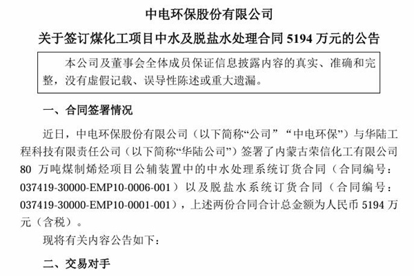 2025年04月16日,中电环保股份有限公司发布《关于签订煤化工项目中水及脱盐水处理合同 5194 万元的公告》。图源:中电环保公告 中电环保与华陆工程科技有限责任公司签署了内蒙古荣信化工有限公司80 万吨煤制烯烃项目公辅装置中的中水处理系统订货合同(合同编号:037419-30000-EMP10-0006-001)以及脱盐水系统订...
