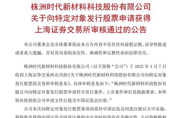 2025年04月08日,株洲时代新材料科技股份有限公司发布《关于向特定对象发行股票申请获得上海证券交易所审核通过的公告》。图源:时代新材公告 株洲时代新材料科技股份有限公司(以下简称“公司”)于2025年4月7日收到上海证券交易所出具的《关于株洲时代新材料科技股份有限公司向特定对象发行股票的交易所审核意见》,...