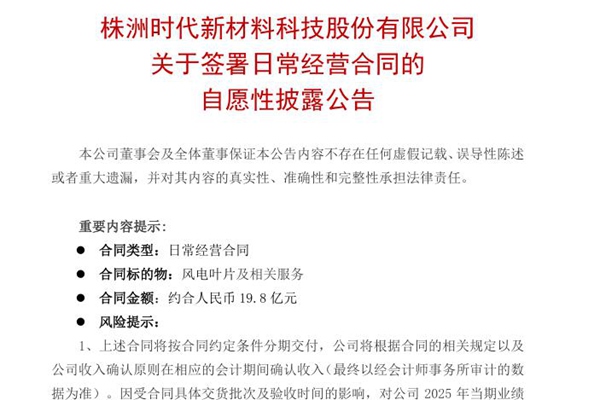 2025年04月04日,株洲时代新材料科技股份有限公司发布《关于签署日常经营合同的自愿性披露公告》。图源:时代新材公告 株洲时代新材料科技股份有限公司2025年1月1日—2025 年3月31日与风电各大主机厂签订《叶片销售合同》。公司向买方销售叶片及相关服务,合同金额总计约合人民币19.8亿元(含税价)。 申明:本站发...
