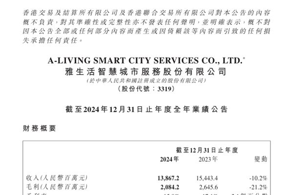 雅生活智慧城市服务股份有限公司(简称:雅生活服务)近日发布《截至2024年12月31日止年度全年业绩公告》。报告期内,雅生活服务总营收为138.67亿元,其中物业服务、业主增值服务和城市服务等非周期性业务收入总额135.01亿元,占总营收比重达97.4%.作为集团战略重心的物业服务板块收入持续攀升至109.81亿元。毛利为20.84亿...