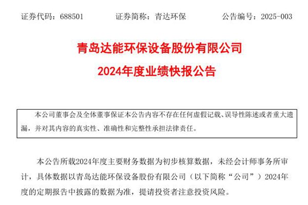 青岛达能环保设备股份有限公司(简称:青达环保)近日发布《2024年度业绩快报公告》。快报显示,青达环保2024年实现营业收入13.14亿元,同比增长27.7%;归母净利润9414.29万元,同比增长8.61%;扣非净利润8184.53万元,同比增长1.35%;基本每股收益0.76元。 青达环保的主业是节能环保设备的设计、制造和销售&...