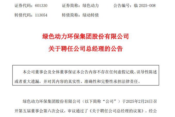 绿色动力环保集团股份有限公司(简称:绿色动力)近日公告称,经公司董事长提名,公司董事会提名委员会审核,公司董事会同意聘任成苏宁先生为公司总经理,即日起生效,董事长乔德卫先生不再代行总经理职责。图源:绿色动力 申明:本站发布此信息的目的在于传播更多信息,与本站立场无关。并且郑重提示所有阅读者,股市有风险,投资需谨慎,本文不作为任何投资...