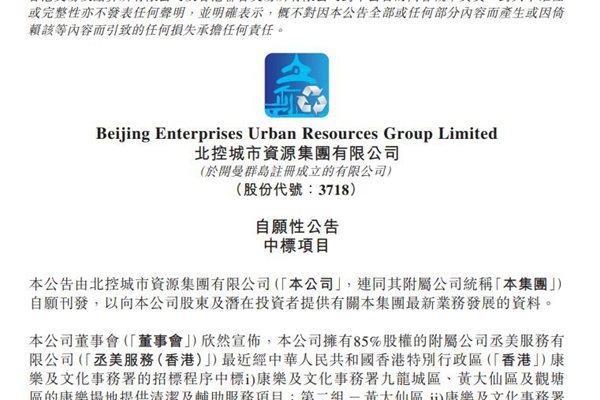 港股上市公司北控城市资源日前发布公告,由本公司持有85%股权的附属公司丞美服务有限公司,于2024 年12月11日中标康乐及文化事务署九龙城区、黄大仙区及观塘区的康乐场地提供清洁及辅助服务项目:第二组-黄大仙区,于2025年1月23日中标康乐及文化事务署北区、沙田区及西贡区的康乐场地提供清洁及辅助服务项目:第一组-北区;及第三组:西贡...