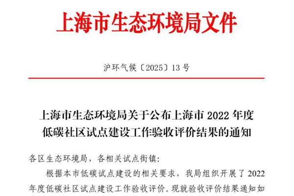 上海市生态环境局关于公布上海市2022年度低碳社区试点建设工作验收评价结果的通知沪环气候〔2025〕13号 各区生态环境局,各相关试点街镇: 根据本市低碳试点建设的相关要求,我局组织开展了2022年度低碳社区试点建设工作验收评价。现就验收评价结果通知如下: 一、上海市低碳示范社区(2022年度)5个 (一)徐汇区虹梅街道华悦家园社...