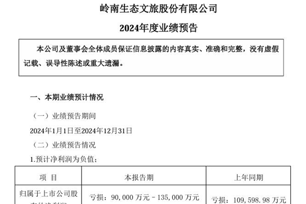 2025年01月23日,岭南生态文旅股份有限公司发布《2024年度业绩预告》。图源:岭南股份公告 预告显示,岭南股份预计2024年亏损90,000万元–135,000万元。 在业绩变动原因说明中,岭南股份表示: 1、2024年营业收入与去年同期相比有较大幅度下滑,因行业受周期性及市场供需变化的影响,业主方投资缩减,公...