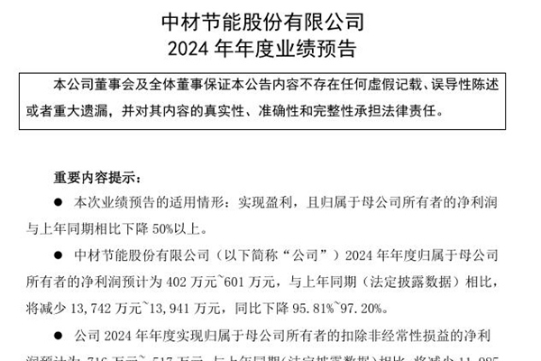 2025年01月22日,中材节能股份有限公司发布《2024 年年度业绩预告》。图源:中材节能公告 预告显示,中材节能预计2024年年度实现归属于母公司所有者的净利润为402万元~601万元,与上年同期(法定披露数据)相比,将减少13,742万元~13,941 万元,同比下降95.81%~97.20%。预计2024年年度实现归属于母公...