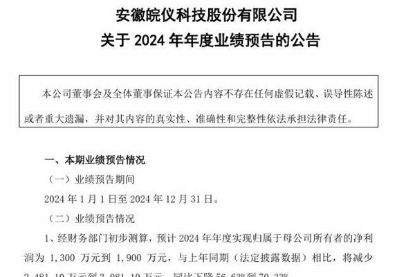 2025年01月22日,安徽皖仪科技股份有限公司发布《关于 2024 年年度业绩预告的公告》。图源:皖仪科技公告 预告显示,皖仪科技预计2024年年度实现归属于母公司所有者的净利润为 1,300 万元到 1,900 万元,与上年同期(法定披露数据)相比,将减少2,481.10 万元到3,081.10 万元,同比下降56.63%到7...
