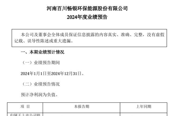 2025年01月21日,河南百川畅银环保能源股份有限公司发布《2024年度业绩预告》。图源:百川畅银公告 预告显示,百川畅银归属于上市公司股东的净利润预计亏损17,000万元-25,000万元,相较上年同期有所扩大。 预告中表示,业绩变动原因有三个——计提资产减值准备的影响,会计政策的影响,增值税退税收入和...