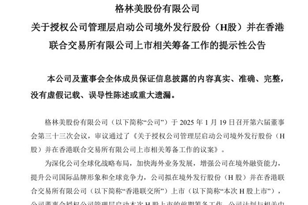 2025年1月21日,格林美股份有限公司发布《关于授权公司管理层启动公司境外发行股份(H股)并在香港联合交易所有限公司上市相关筹备工作的提示性公告》。图源:格林美公告 公告表示,为深化公司全球化战略布局,加快海外业务发展,增强公司在境外融资能力,提升公司国际品牌形象和全球竞争力,公司拟在境外发行股份(H股)并在香港联合交易所有限公司...