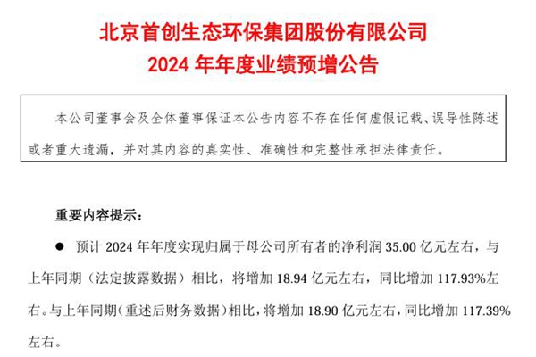 2025年01月22日,北京首创生态环保集团股份有限公司发布《2024 年年度业绩预增公告》。图源:首创环保公告 预告显示,首创环保预计2024年年度实现归属于母公司所有者的净利润35.00亿元左右,与上年同期(法定披露数据)相比,将增加18.94亿元左右,同比增加117.93%左右。与上年同期(重述后财务数据)相比,将增加18....