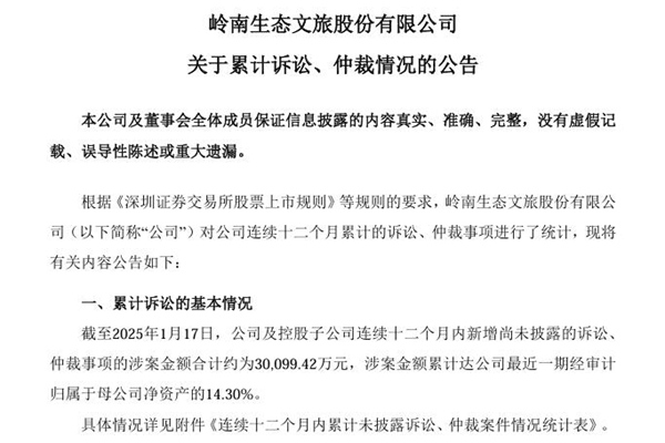 2025年1月21日,岭南生态文旅股份有限公司发布《关于累计诉讼、仲裁情况的公告》。图源:岭南股份公告 公告称,截至2025年1月17日,公司及控股子公司连续十二个月内新增尚未披露的诉讼、仲裁事项的涉案金额合计约为30,099.42万元,涉案金额累计达公司最近一期经审计归属于母公司净资产的14.30%。 申明:本站发布此信息的目的...