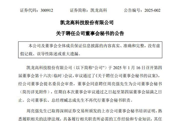 凯龙高科技股份有限公司(简称:凯龙高科)1月16日公告称,公司召开第四届董事会第十六次(临时)会议,审议通过了《关于聘任公司董事会秘书的议案》,经公司董事会提名委员会审查,董事会同意聘任周亮强先生为公司董事会秘书。图源:凯龙高科公告 公开资料显示,凯龙高科作为国家碳达峰、碳中和战略目标的先行者之一,研发生产了满足国六排放标准的商用车...