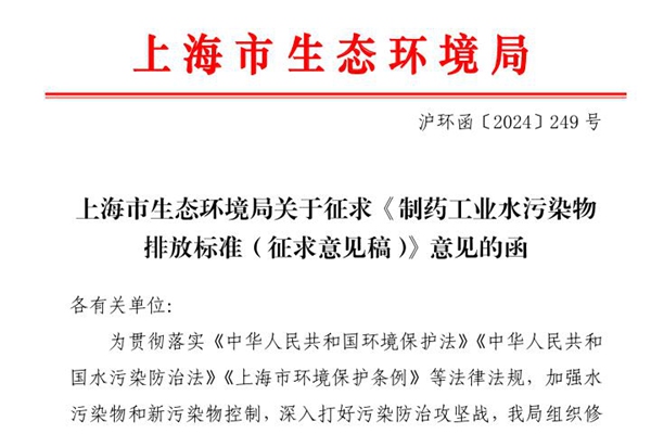 上海市生态环境局关于征求《制药工业水污染物排放标准(征求意见稿)》意见的函沪环函〔2024〕249号 各有关单位: 为贯彻落实《中华人民共和国环境保护法》《中华人民共和国水污染防治法》《上海市环境保护条例》等法律法规,加强水污染物和新污染物控制,深入打好污染防治攻坚战,我局组织修订了上海市地方污染物排放标准《制药工业水污染物排放标准(...